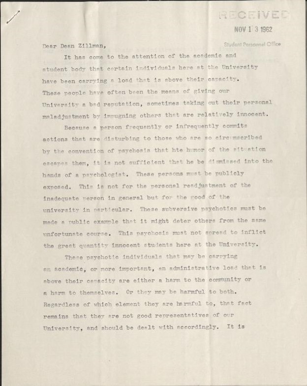 The driving force behind the purge was Dean of Men Theodore Zillman, whose job was to oversee and control the behavior of male students. In this period, Zillman alongside many other university staff became increasingly concerned about student conduct as it related to “sexual deviancy,” a vague term which included everything from gay men, to voyeurs (Peeping Toms), to men who went to parties with unchaperoned women.[1] Many of these problems stemmed from the fact that gender segregation, which had been the norm, was no longer possible. For years the university had been over-admitting students, causing a housing crisis for young women who had to adhere to strict guidelines about where they could live off-campus. Single women had to choose from special university-approved apartment buildings that both did not allow male tenants and which hired a chaperone to enforce curfews and forbid men from entering. In 1959, the University ended most chaperoning requirements on the stipulation that students were now liable if they were to “‘endanger the moral integrity of another” or damage the “good name of the university”.[2] Once male-female conduct rules had loosened, the moral panic over sexuality concerning sex shifted largely onto gay men.